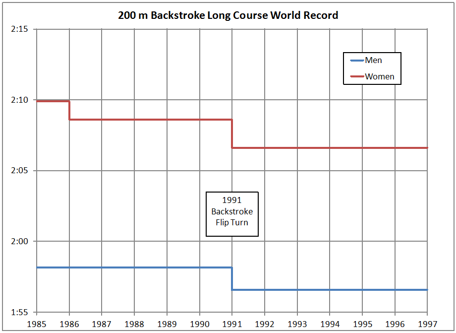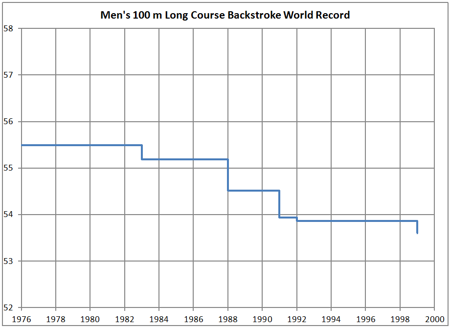 Here’s a graph of the Men’s 100 M Backstroke WR from 1975 through to 1999. Those drops are mainly due to two things: underwater kicking, and the backstroke flip turn rule change discussed below.