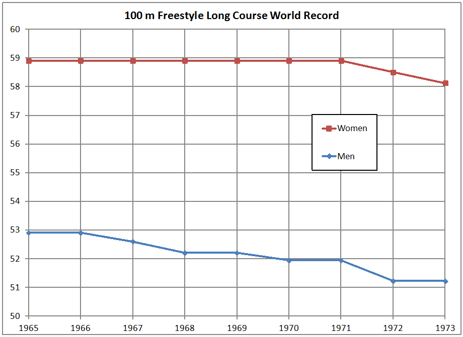 To check this theory for swimming, I’ve compared the top swimmers from the 2012 Olympics, Michael Phelps and Missy Franklin, with top swimmers from the 1970s, Mark Spitz (1972 Olympics) and Kornelia Ender (1976 Olympics, and since determined to have been using performance enhancing drugs – irrelevant for our purposes here). I’ve added Shirley Babashoff as well, as she would have been the dominant swimmer of the 1970s if you don’t count the East Germans.