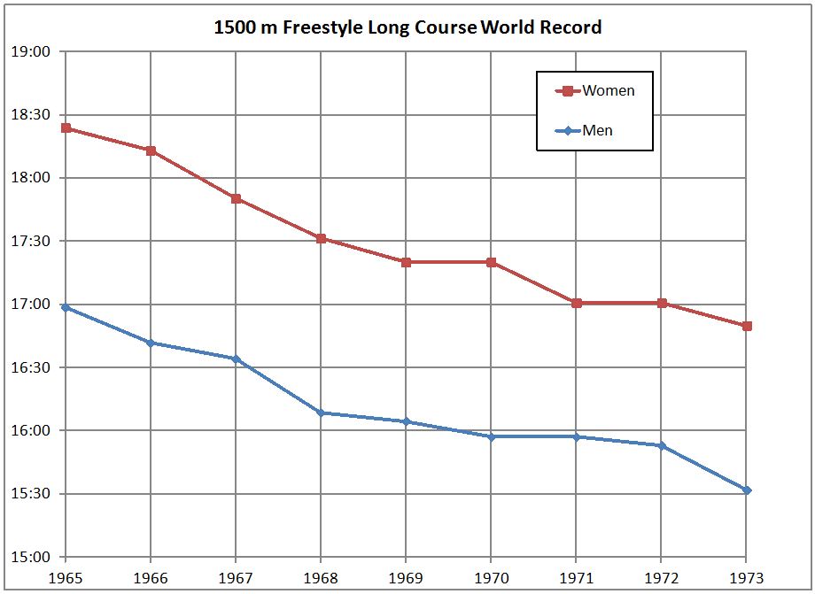 Let’s dive further into the data to see if we can find out more. The two charts below show the 100 Free and 1500 Free records. I’ve chosen these, as they should represent the events in which goggles should have the least and most effect. I’ve picked 1965 and 1973 as the end points, as 1965 marks the start of home made goggles, and 1973 marks the start of the East German doping program.
