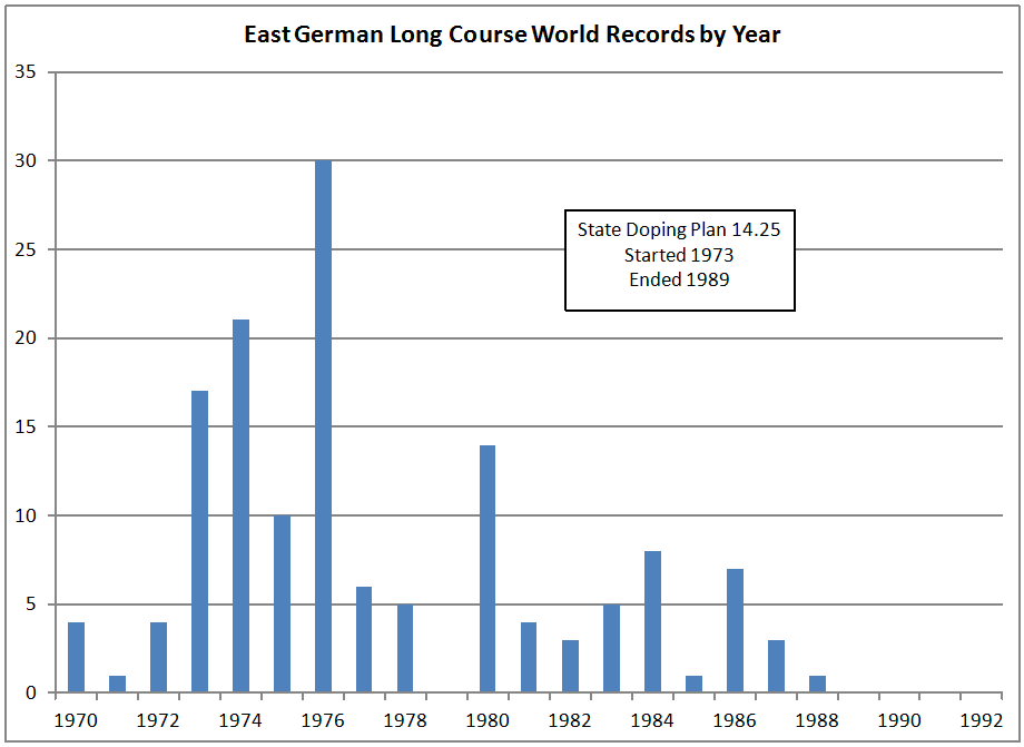 You can see by the chart below the enormous impact doping had on their performance, with the East Germans alone setting more world records in 1976 than the whole world set for most other years.