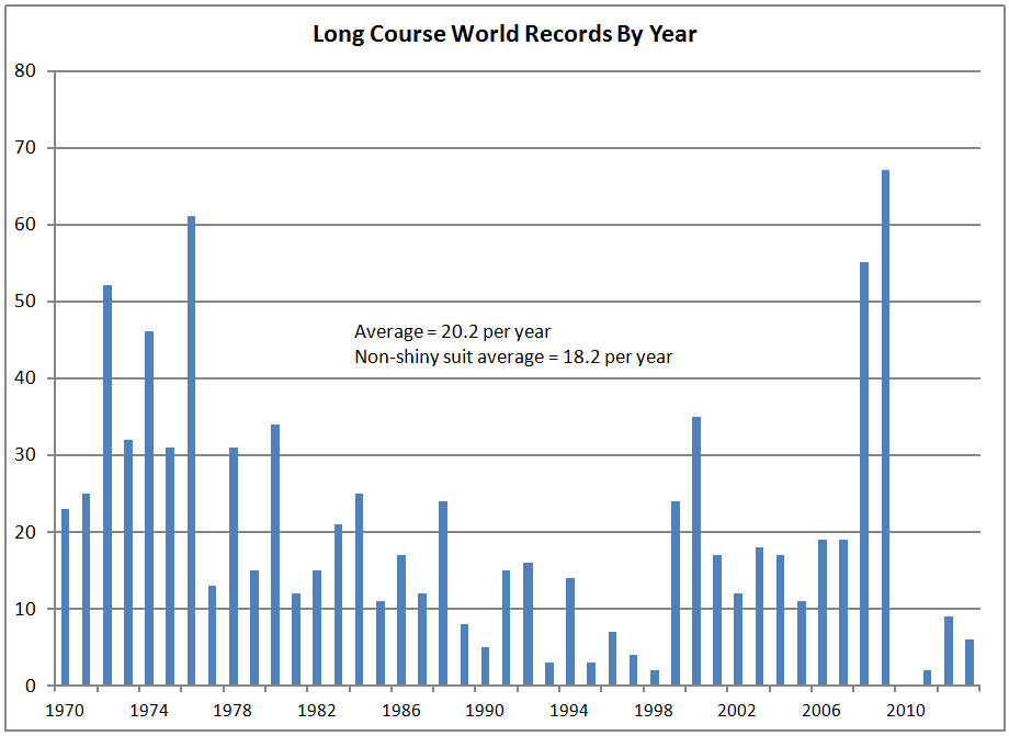 But first, let’s address the underlying issue. Are swimmer really getting faster, better, stronger? I think we all intuitively know this is the case, but let’s look at some numbers. Below is a chart showing the number of long course world records set by year from 1970 onwards. You can immediately see that other than dry spells in the mid-1990s, and in our post-shiny suit era, world records are set at a staggering pace.
