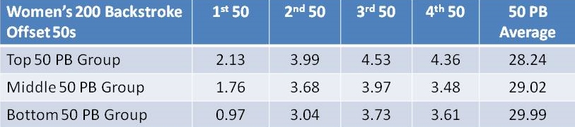 The elite women swim the 200 backstroke primarily as a distance event, with only a few swimmers using a sprinter’s (gradually slowing) profile. In general, backstrokers with the best 50 PBs swim with higher offsets, while those with higher PBs have to swim closer to their PBs.