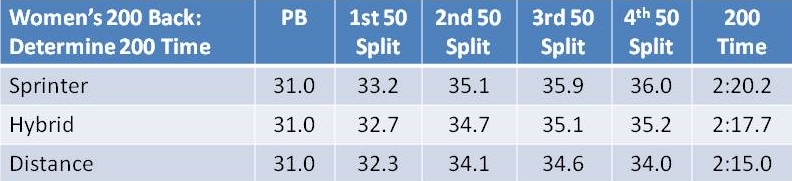 We have basic profiles for sprint-oriented, distance-oriented and hybrid swimmers doing the 200. Below is the 50 PB table from the 200 Free analysis that shows the different splits breakdown for these profiles. I didn’t adjust for a dive start versus an in-water start simply because the freestyle and backstroke offsets are so similar. There should be a difference for the two strokes as the freestyle PB was done with a dive, but the data doesn’t support this difference. But I did round up to the next tenth of a second.