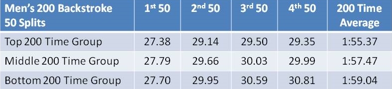 1) What are the different ways in which the elite 24 swimmers swim the 200 backstroke? It’s more or less divided into those swimmers who are sprint-oriented, endurance-oriented, and in-between.