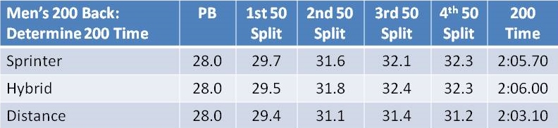 We can use these to work backwards from a 200 goal time to determine a set of 50 splits. This table shows the method. We’ll use a goal time of 2:00.00, and we’ll run it for all three profiles.