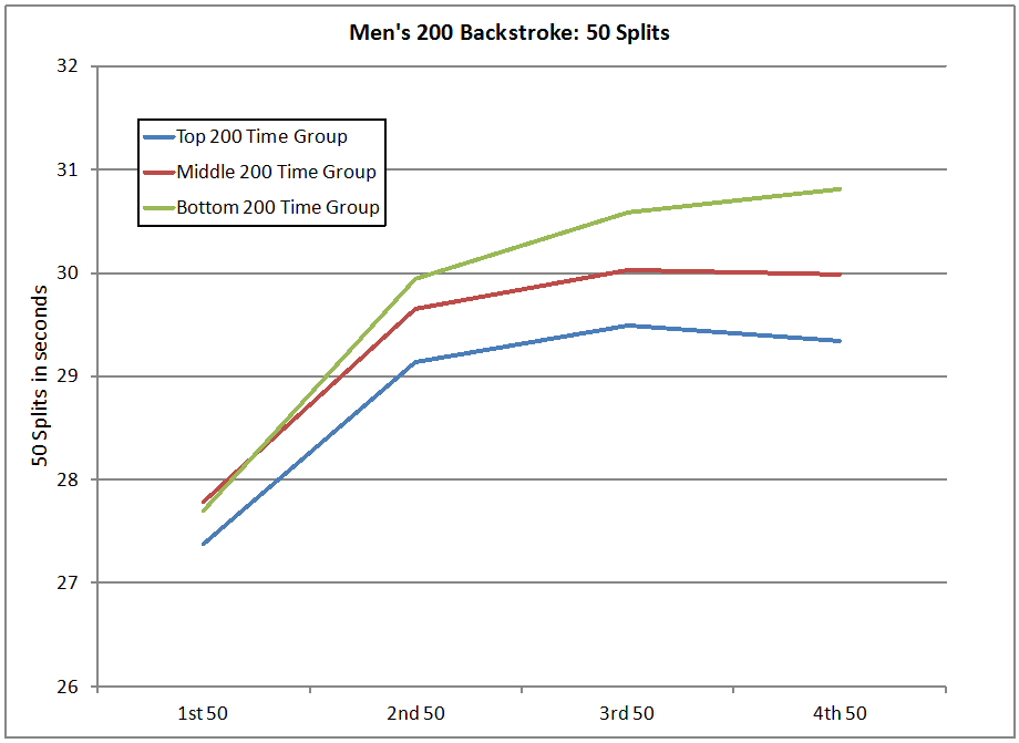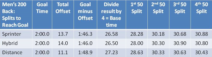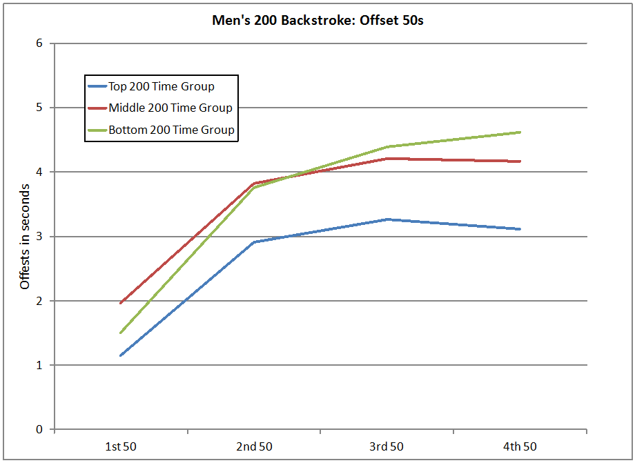 From our 3rd 50 Split graph, we have basic profiles for sprint-oriented, distance-oriented and hybrid men doing the 200 backstroke. Below are the average offsets for each 50 for each of these profiles.