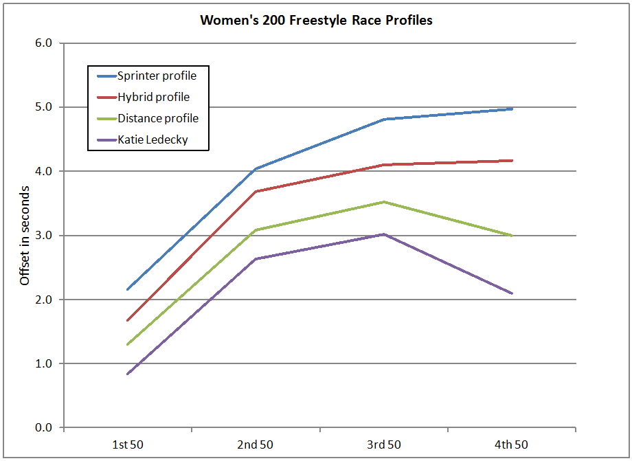 I like the idea of using profiles and offsets simply because they lend themselves to use by those who are not elite. A sprint-oriented swimmer can develop a 50-by-50 strategy for the race based on the sprinter profiles. Same with distance-oriented swimmers. It provides a wealth of information that is harder to find when looking at 100 PBs.