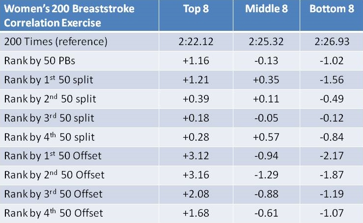 This leads us to rank the swimmers on the basis of their 4th 50, and then put them into our Top, Middle and Bottom groups of 8. I’ve included both the display of 50 splits and 50 Offsets Here are the results.