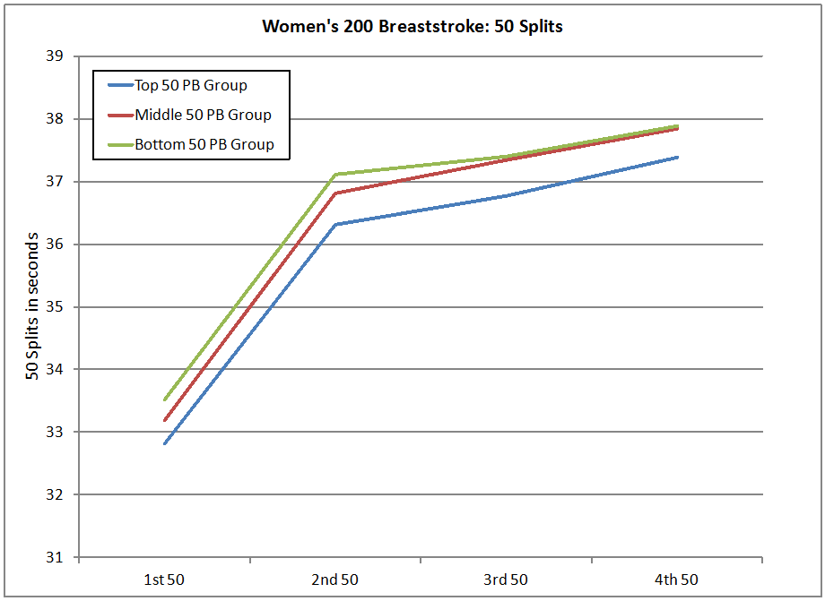 The women’s 200 breaststroke resembles the 200 butterfly in that the first part of the race is performed pretty much the same by everybody, regardless of their 50 PB or anything else. For the butterfly, the similarity lasted for the first 150, while for the breaststroke it only lasted the first 100. Specifically, the first 50 is done roughly 1.5 seconds above PB, and the second 50 about 5.0 seconds above PB. After that the race is finished with one of three profiles which are very similar to the butterfly profiles. A Dying profile (last two 50s at 1 second or more above the 2nd 50), a Fading profile (last two 50s at roughly 0.5 seconds above the 2nd 50) and a Finishing profile (last two 50s roughly equal or faster than the 2nd 50).