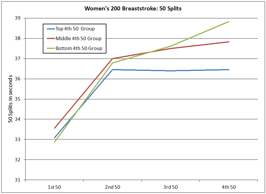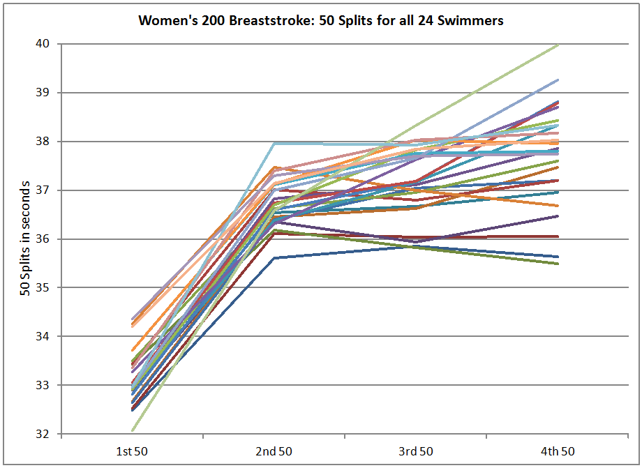 The table verifies that the 4th 50 has the greatest variation in splits. But what’s surprising is that this variation (std dev. = 1.1) is far greater than for any 50 in the 200 freestyle, backstroke or butterfly. In other words, the last 50 of the women’s 200 breaststroke is the wildest 50 of any of the 200s. And that’s after a pretty wild 3rd 50.