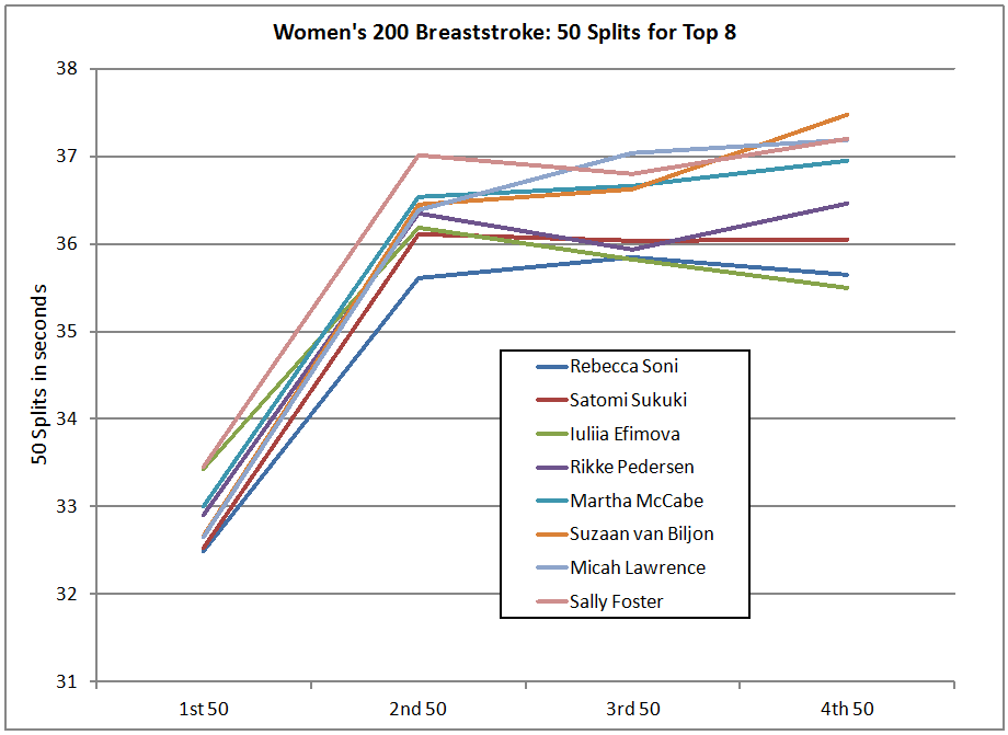 The top 8 are differentiated by their ability to swim the first 100 slightly faster than the rest, and the last 100 significantly faster than the rest. None of the top 8 used a Dying profile. The Olympic champion, Rebecca Soni, used her impressive top-end speed to aggressively grab a lead in the first 100, and then swim evenly through the last 100 and win easily. Once again, top end speed wins the day in the 200.