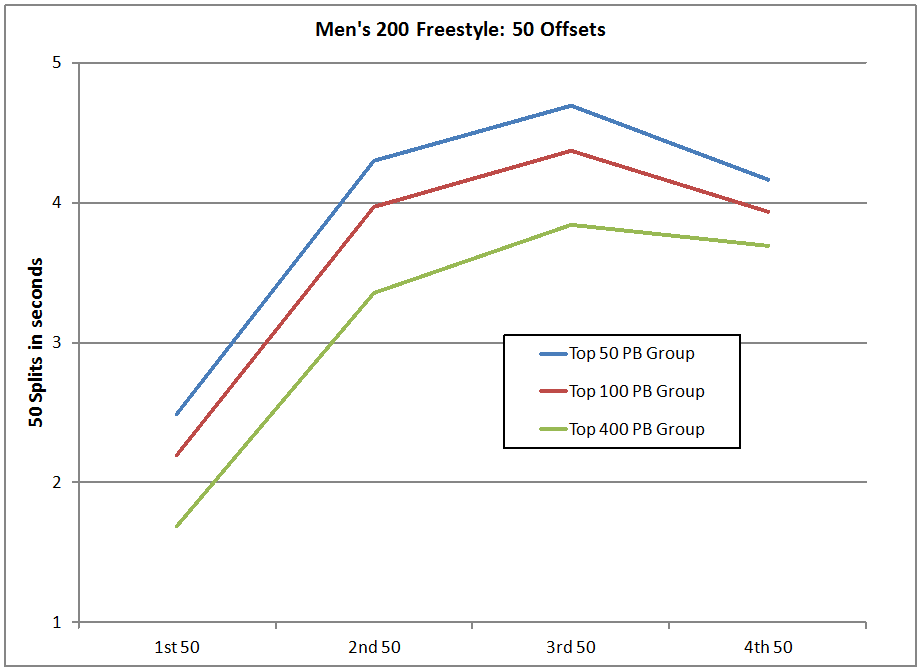I also included a chart of the 50 Offsets, which I’ve found provide a wealth of information. The 50 PB group is able to achieve their high speed in the first 50 with an offset (time above their 50 PB) of roughly 2.3 seconds. The 400 PB group started out more slowly, but had to push hard with an offset of only 1.9 seconds. But this is a 200, and so over the four 50s we can gradually see the differences. The range between the fastest 50 and slowest 50 in the 50 PB group is roughly 2.7 seconds (lowest offset 2.3, highest 5.0). The 400 PB group have a range of only 2.1 seconds (1.9 to 4.0). Again, this is as expected, but interesting, and could be used as a guideline for other swimmers as to how to swim their 200.