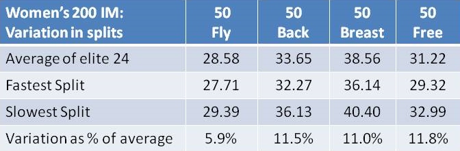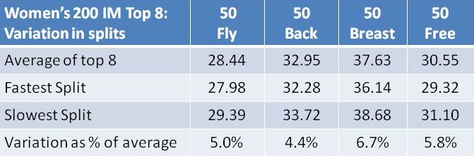 We can see that the butterfly splits are pretty tight, with only 5.9% variation from fastest to slowest. No doubt this has something to do with everyone swimming it fresh, but it may also be that having a slow butterfly puts you in too big of a disadvantage right away. The other three 50s all shows roughly equal variations, and all roughly twice that of the butterfly split. Butterfly seems to be a common strength among the elite 24.