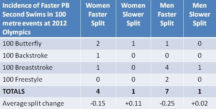 Here we see that there were 13 Faster PB Second Swims, with 11 of them involving a faster 50 split than in their earlier PB swim. (Note that the only 2 exceptions split only 0.02 and 0.11 seconds slower). So 11 swimmers adopted a risky strategy, going out an average of 0.22 seconds faster than their PB split, and it worked. Clearly, going out faster was a successful strategy for them.