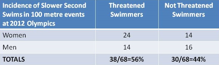 Threatened swimmers showed only a mild increase in Slower Second Swims when compared to non-threatened swimmers. It appears that the assumption that threatened swimmers would be the major source for Slower Second Swims is not valid.