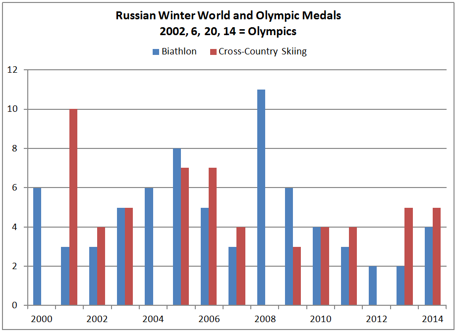 This all sounds very persuasive, but there is a problem. if the Russians have a huge state-sponsored doping program, we’d expect the world to notice. When East Germany embarked on their State Plan 14.25 it only took a few years for their athletes to start dominating, and they continued to dominate for over 20 years. The world took notice. At the present, the Russians merely appear to be merely treading water, with results that are keeping them at the status quo.